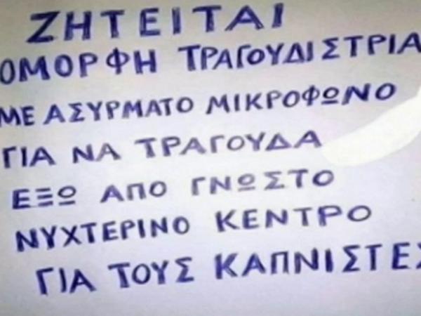 Έτσι λοιπόν χιουμοριστική αγγελία που έχει γίνει viral αναφέρει ότι ένα νυχτερινό κέντρο ζητάει τραγουδίστρια για να τραγουδάει έξω από το μαγαζί για τους καπνιστές!