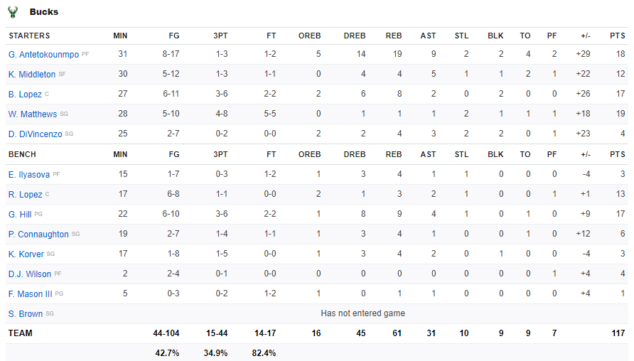 Ο Γιάννης Αντετοκούνμπο αγωνίστηκε για 31 λεπτά και άγγιξε το triple double καθώς τελείωσε το ματς με 18 πόντους, 19 ριμπάουντ, 9 ασίστ, 2 κλεψίματα και 2 μπλοκ. Ο Μάθιους είχε 19 πόντους και ήταν ο πρώτος σκόρερ για τα «Ελάφια» με τους Χιλ και Λόπεζ να προσθέτουν από 17 πόντους.