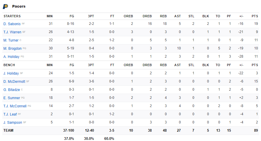Για τους ηττημένους ο Σαμπόνις είχε 19 πόντους και 18 ριμπάουντ και ο ΜακΝτέρμοντ 15 πόντους.