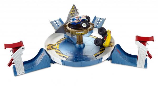 Δύο οχήματα Hot Wheels® με τεράστιες ρόδες αναμετρούνται μεταξύ τους και με έναν άγριο μηχανικό καρχαρία. Το ένα όχημα είναι ένα Φορτηγό Αγώνων Hot Wheels® και το άλλο ένα μοναδικό όχημα που ονομάζεται “Crash Recruit”. Τα παιδιά δοκιμάζουν τις ικανότητές τους σε μία κυκλική πίστα με ένα μεγάλο τρόπαιο στο κέντρο. Ξεκινήστε τη δράση τοποθετώντας τα οχήματα στους εκτοξευτές και ελευθερώστε τα για να συγκρουστούν. Προσγειωθείτε μέσα στο τρόπαιο για να κερδίσετε ή αστοχήστε και γίνετε δόλωμα για τον καρχαρία!