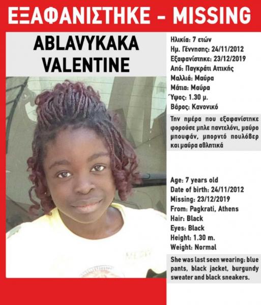 «Στις 23/12/2019, στις 16:00, εξαφανίστηκε από το Παγκράτι Αττικής η Valentine Ablavykaka, 7 ετών, με καταγωγή από το Κονγκό. Το «Χαμόγελο του Παιδιού» ενημερώθηκε για την εξαφάνιση της ανήλικης σήμερα, 25.12.2019, απογευματινές ώρες και προχώρησε άμεσα στην ενεργοποίηση του μηχανισμού AMBER ALERT HELLAS”, αναφέρει χαρακτηριστικά το Χαμόγελο στην ανακοίνωσή του.