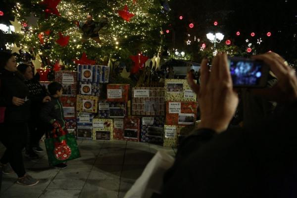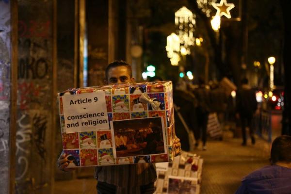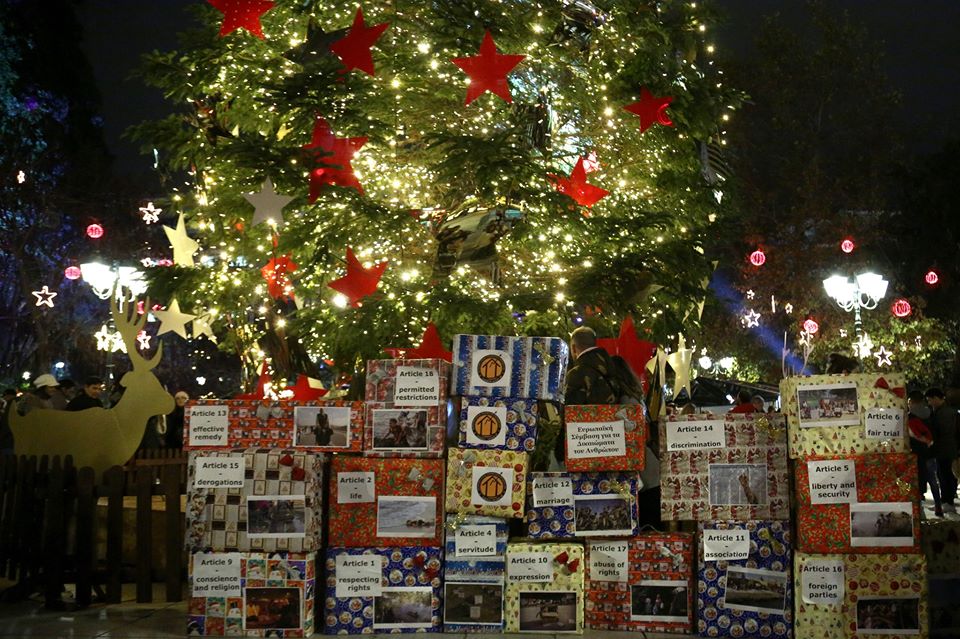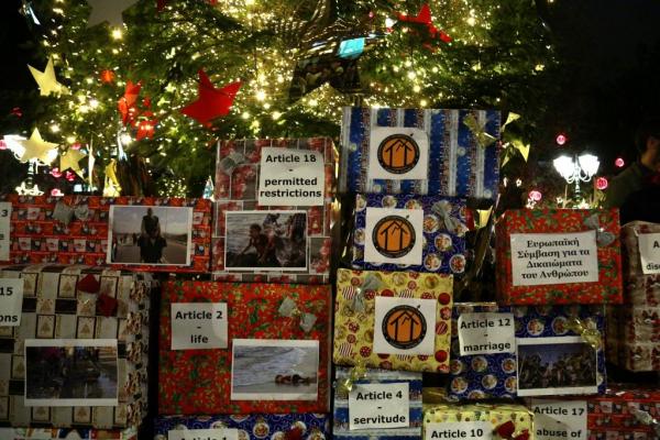 Πρόσφυγες που μένουν στο κέντρο της Αθήνας άφησαν «δώρα» με τα 18 άρθρα για τα ανθρώπινα δικαιώματα κάτω από το χριστουγεννιάτικο δέντρο στο Σύνταγμα, σε μία συμβολική διαμαρτυρία για την στάση που τηρεί η ΕΕ στο προσφυγικό.