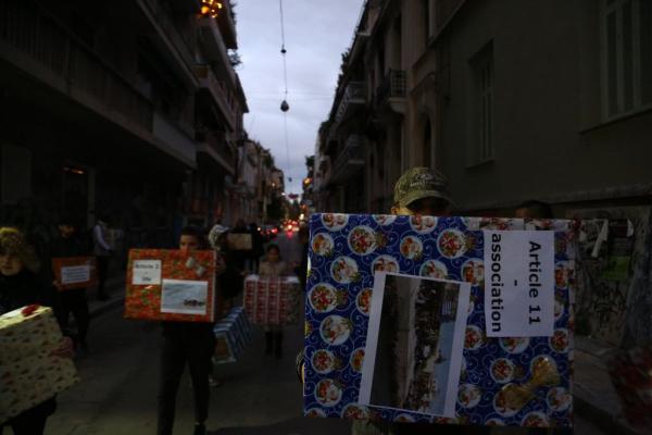 Το βράδυ της Τρίτης, παραμονής Χριστουγέννων, μέλη της κοινότητας της προσφυγικής κατάληψης Νοταρά 26, βάδισαν μέχρι το στολισμένο δέντρο στη πλατεία Συντάγματος.