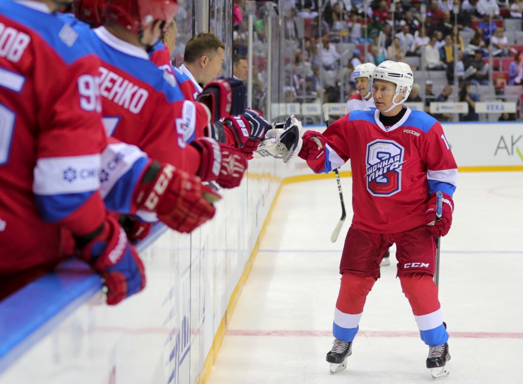 Στην ομάδα του, με την κόκκινη στολή, συμμετέχουν επίσης ο υπουργός Άμυνας Σεργκέι Σόιγκου, οι πρώην αστέρες του χόκεϊ Παβέλ Μπούρε, Βαλέρι Καμένσκι, Σεργκέι Φεντόροφ και άλλοι παίχτες.