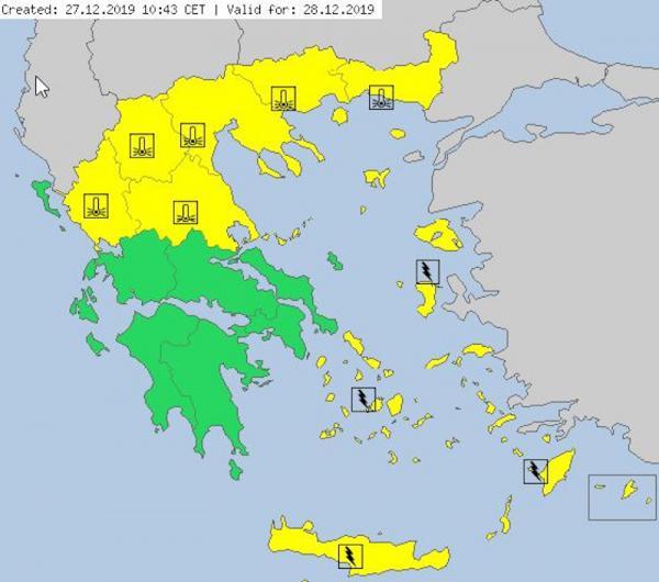 Η θερμοκρασία θα κυμανθεί από -5 έως 5 βαθμούς στη Δυτική Μακεδονία, από -2 έως 8 στην υπόλοιπη Βόρεια Ελλάδα, από -1 έως 11 βαθμούς στην Ήπειρο, από -2 έως 9 στην Κεντρική Ελλάδα, από 2 έως 12 στη Δυτική και Νότια Ελλάδα, από 2 έως 10 βαθμούς στα υπόλοιπα ηπειρωτικά, από 2 έως 12 στα νησιά του Ιονίου, από 2 έως 9 βαθμούς στα νησιά του Βόρειου και Βορειοανατολικού Αιγαίου και από 6 έως 14 βαθμούς στα υπόλοιπα νησιωτικά τμήματα του Αιγαίου και την Κρήτη.