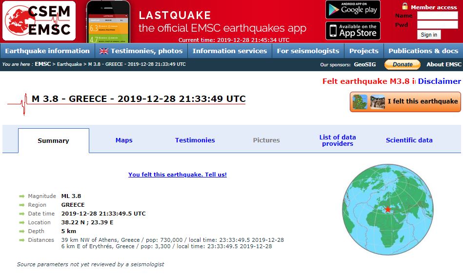 Οι πρώτες εκτιμήσεις του Ευρωμεσογειακού Ινστιτούτου έκαναν επίσης λόγο για σεισμό μεγέθους 3,8 της κλίμακας Ρίχτερ, που σημειώθηκε 39 χιλιόμετρα βορειοδυτικά της Αθήνας.