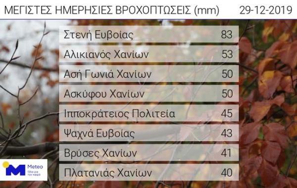 Στον πίνακα που ακολουθεί παρουσιάζονται οι οκτώ σταθμοί του δικτύου του Εθνικού Αστεροσκοπείου Αθηνών / meteo.gr που κατέγραψαν τα μεγαλύτερα ύψη βροχής / χιονιού έως τις 20:00.