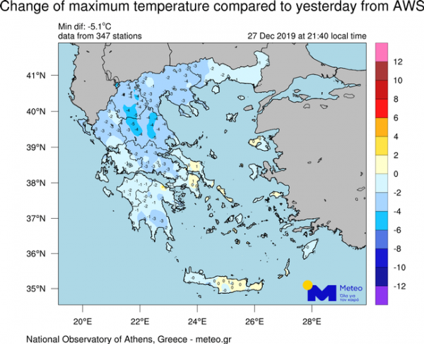 Όπως προκύπτει από το χάρτη οι θερμοκρασίες σημείωσαν πτώση σε ολόκληρη τη χώρα, έως και κατά 5 βαθμούς Κελσίου.