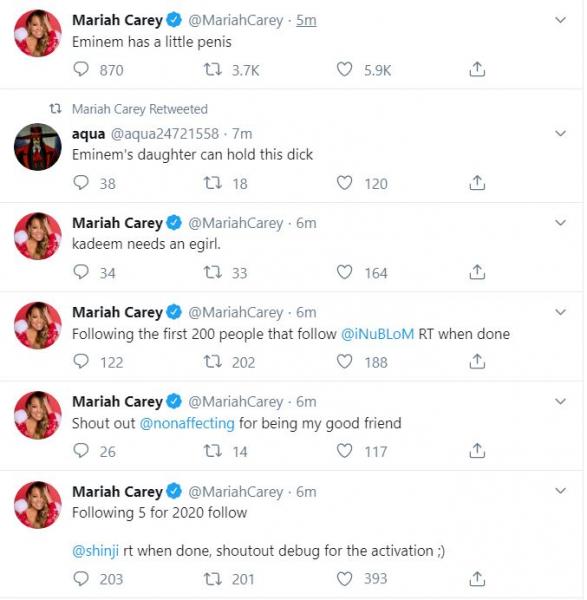 Συγκεκριμένα, λίγο πριν αλλάξει ο χρόνος, η Μαράια Κάρεϊ άρχισε να στέλνει tweets όχι για ευχές, αλλά για το μικρό μέγεθος του… μορίου του ράπερ Έμινεμ.
