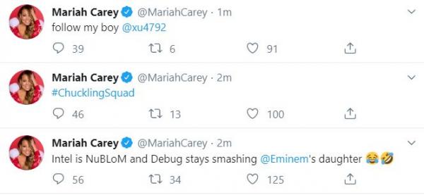 Ωστόσο σύμφωνα με το USA Today το Twitter εξετάζει την παραβίαση της ασφάλειας του λογαριασμού της Μαράια Κάρεϊ, η οποία πλέον έχει ανακτήσει τον πλήρη έλεγχο του και ανήρτησε για τον νέο χρόνο ένα βίντεο με τα δίδυμά της Μορόκαν και Μονρόε.