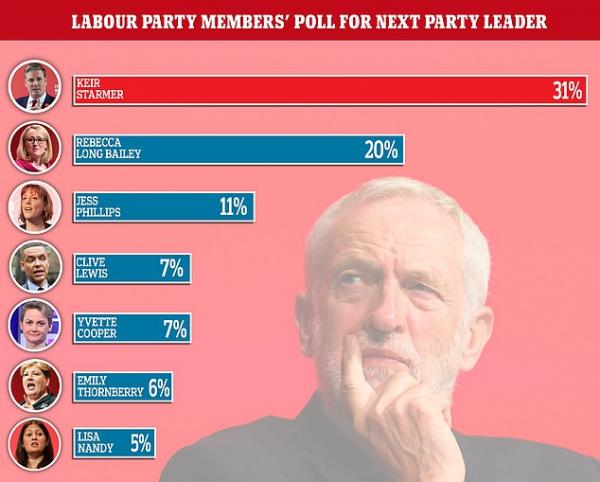 Σε δημοσκόπηση που έγινε για λογαριασμό της Guardian, αυτός που φέρεται να είναι πρώτος στις προτιμήσεις, είναι ο Κέιρ Στάρμερ, ο οποίος ωστόσο είναι από αυτούς που ακόμη δεν έχει τοποθετηθεί δημόσια για το αν θα βάλει υποψηφιότητα για την ηγεσία. Στην έρευνα του YouGov ωστόσο, φέρεται να είναι πρώτος στις προτιμήσεις των ψηφοφόρων των Εργατικών, κατά 31%, έναντι 20% της Ρεμπέκα Λονγκ Μπέιλι.