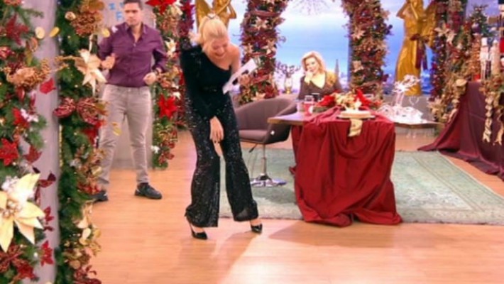 Και ήταν ο Δημήτρης Ουγγαρέζος εκείνος που έσπευσε να βοηθήσει, για να διαπιστώσει ότι οι παγιέτες του παντελονιού της παρουσιάστριας είχαν «δέσει» τα πόδια της.