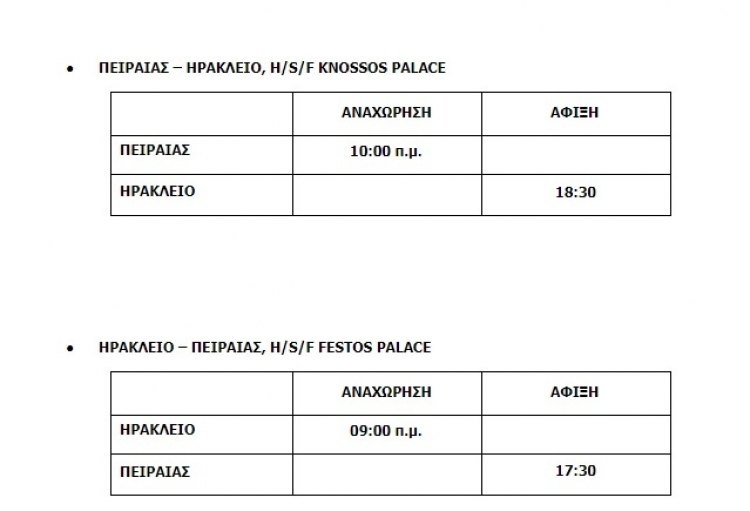 Για περισσότερες πληροφορίες, παρακαλούνται οι κύριοι επιβάτες να απευθύνονται στον ταξιδιωτικό τους πράκτορα, στα Κεντρικά Πρακτορεία των Μινωικών Γραμμών, μέσω του Πανελλαδικού Αριθμού Κρατήσεων 801-11-75000 (από σταθερό τηλέφωνο), στα κεντρικά πρακτορεία ή στα λιμενικά γραφεία της εταιρείας (Ηράκλειο: 2810-399899, 2810-330327, Πειραιάς: 210-4145744, 210-4080028, Αθήνα: 210 3376910, Σούδα: 6972-552661, 28210-81276, Χανιά: 28210-45911-12)».