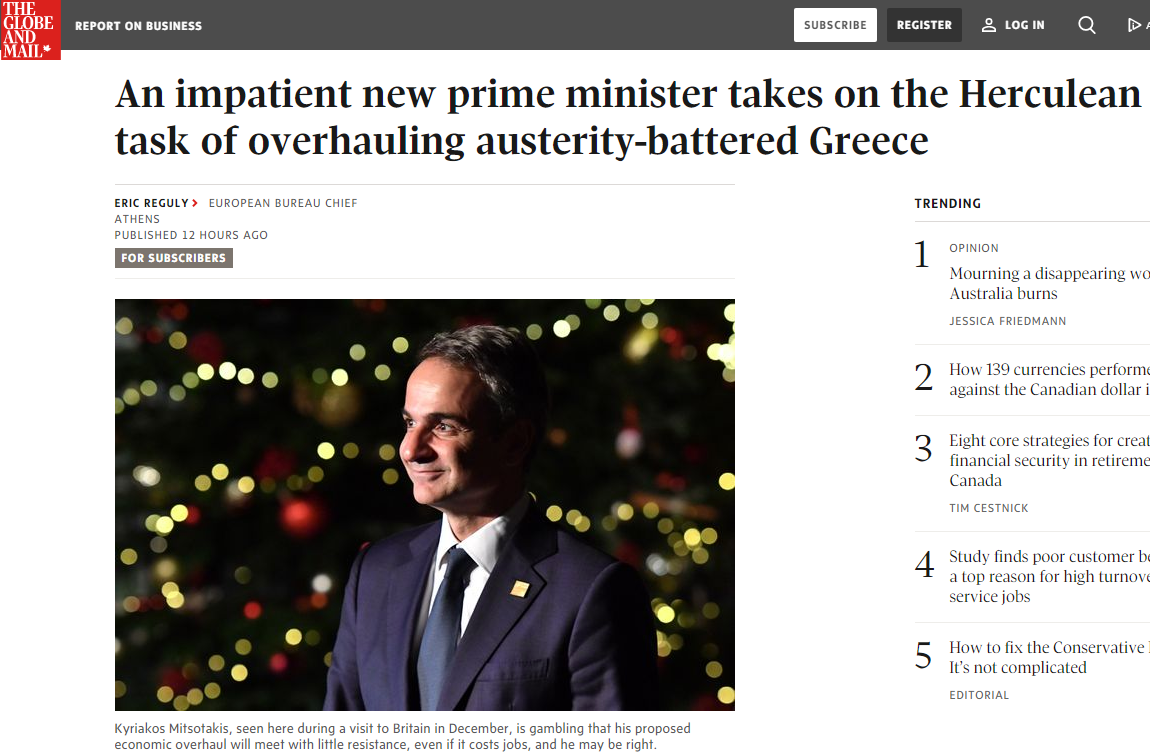 «Το όραμά του για την Ελλάδα δεν είναι τίποτε λιγότερο από επαναστατικό» αναφέρει η καναδική εφημερίδα για τον Κυριάκο Μητσοτάκη και προσθέτει: «Θέλει να δημιουργήσει μια ανταγωνιστική οικονομία, η οποία θα λειτουργεί ως μαγνήτης για τις ξένες επενδύσεις και δεν θα εξαρτάται μόνο από τον ήλιο και τη θάλασσα».