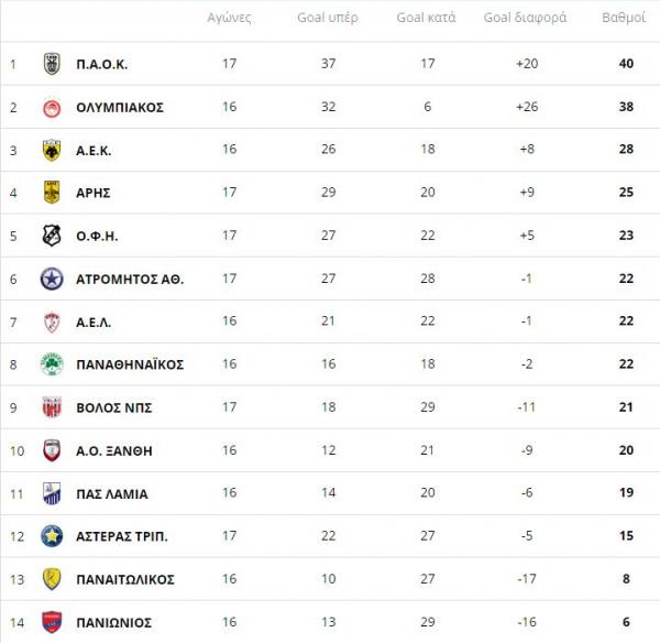 Δείτε πως διαμορφώθηκε η βαθμολογία της Super League μετά τα σημερινά ματς της 17ης αγωνιστικής.