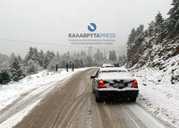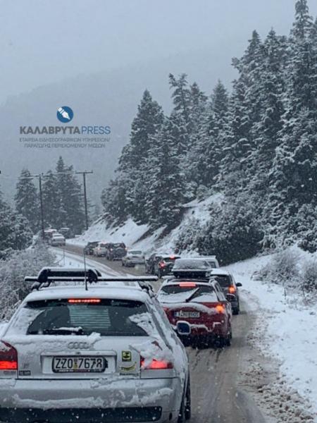 Την ίδια ώρα, μέτρα για τη ρύθμιση της κυκλοφορίας έχει λάβει η Αστυνομία στην επαρχιακή οδό Πούντας – Καλαβρύτων. Οι αστυνομικοί απαγορεύουν στα φορτηγά και στα βαρέα οχήματα να διέλθουν, ενώ όσοι οδηγοί δεν έχουν αλυσίδες μαζί τους, δεν τους επιτρέπεται να διέλθουν από το δρόμο.