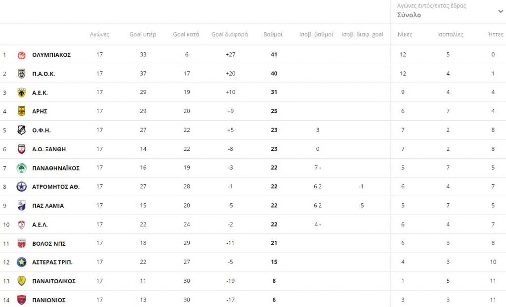 Η βαθμολογία μετά από 17 αγωνιστικές: