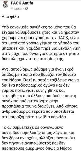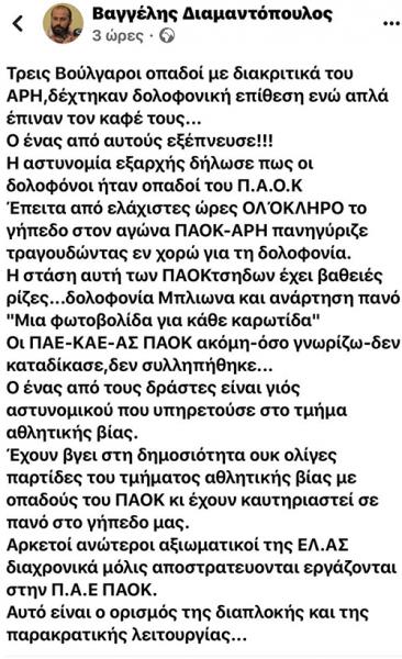 Η στάση αυτή των ΠΑΟΚτζήδων έχει βαθιές ρίζες. Δολοφονία Μπλιώνα και ανάρτηση πανό “μια φωτοβολίδα για κάθε καρωτίδα”». Και προσθέτει. «Ο ένας από τους δράστες είναι γιός αστυνομικού που υπηρετούσε στο τμήμα αθλητικής βίας.