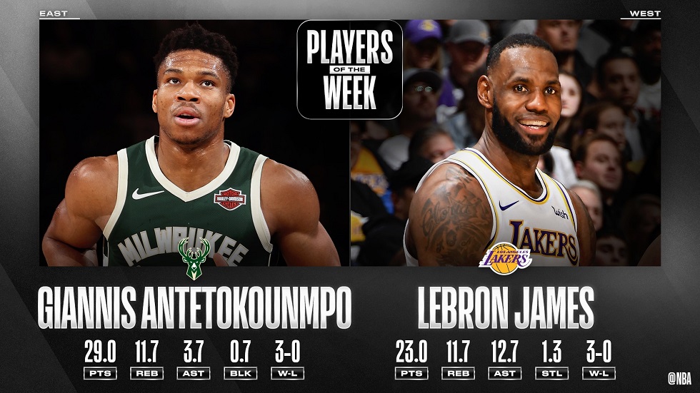 Ο σούπερ σταρ των Μιλγουόκι Μπακς πήρε το βραβείο του καλύτερου παίκτη της εβδομάδας στην Ανατολή, ενώ το αντίστοιχο βραβείο για τη Δύση πήγε στον τεράστιο Λεμπρόν Τζέιμς.