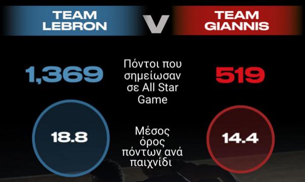 Μάλιστα, όπως δείχνει το παραπάνω infographic, η ομάδα του ΛεΜπρόν σημείωσε 1369 πόντους σε All Star Game, έναντι 519 που σκόραρε η ομάδα του MVP Γιάννη Αντετοκούμπο, έχοντας 14,4 πόντους ανά παιχνίδι.
