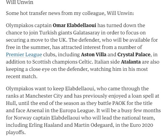 Κλείνοντας το σχετικό δημοσίευμα τονίζει πως ο Ολυμπιακός θέλει να τον κρατήσει τουλάχιστον μέχρι το τέλος της χρονιάς, καθώς έχει στόχο την κατάκτηση του πρωταθλήματος, ενώ θέλει να προκριθεί και στους «32» του Europa League απέναντι στην Άρσεναλ.