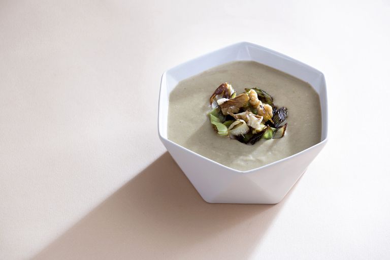 Γαρνίρισμα: Βάζουμε ένα τηγάνι σε μέτρια προς δυνατή φωτιά. Σοτάρουμε στο λάδι το πράσο να πάρει χρώμα. Προσθέτουμε το σιρόπι σφενδάμου. Αλατοπιπερώνουμε και ανακατεύουμε μέσα και τα χοντροκομμένα καρύδια. Αποσύρουμε από τη φωτιά. Σερβίρουμε τη σούπα με το σοταρισμένο γαρνίρισμα από πάνω.