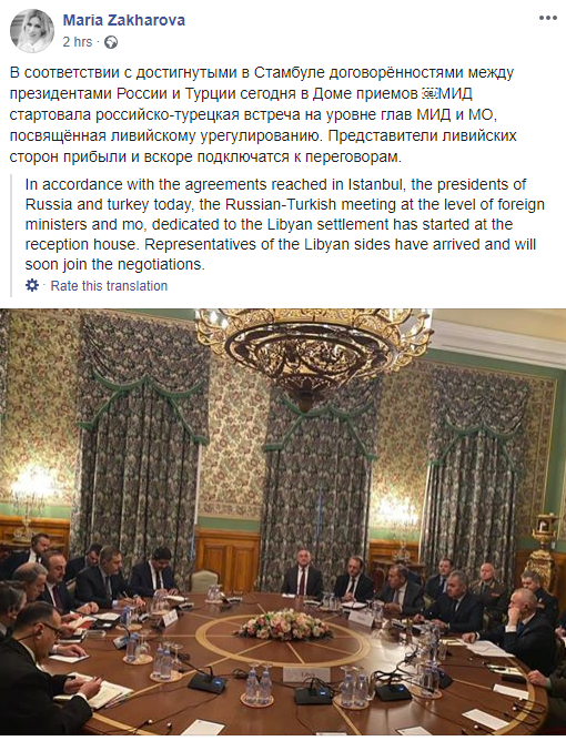 «Σύμφωνα με τις συμφωνίες στις οποίες κατέληξαν οι πρόεδροι Ρωσίας και Τουρκίας στην Κωνσταντινούπολη, η ρωσοτουρκική συνάντηση για τη διευθέτηση της κρίσης στη Λιβύη σε επίπεδο επικεφαλής των υπουργείων Εξωτερικών και Άμυνας ξεκίνησε στην αίθουσα υποδοχής του υπουργείου Εξωτερικών. Εκπρόσωποι των λιβυκών πλευρών έχουν φτάσει και σύντομα θα συμμετάσχουν στις συνομιλίες» έγραψε η Μαρία Ζαχάροβα, στο Facebook.