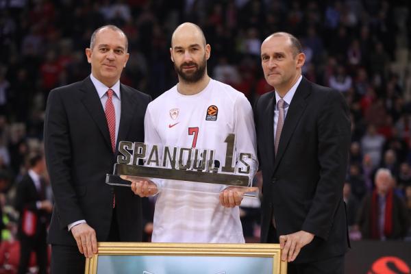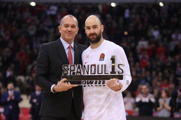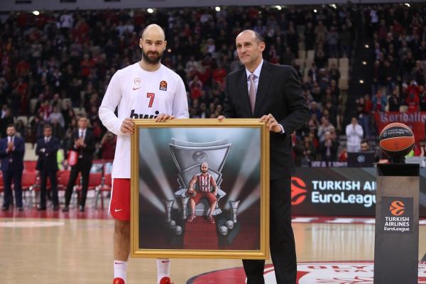 Ο ηγέτης των Πειραιωτών βραβεύτηκε πριν το τζάμπολ του παιχνιδιού με την Αλμπα από την «ερυθρόλευκη» ΚΑΕ, μέσω των Παναγιώτη και Γιώργου Αγγελόπουλου, για την ανάδειξή του σε πρώτο σκόρερ στην ιστορία της Ευρωλίγκας και αποθεώθηκε.