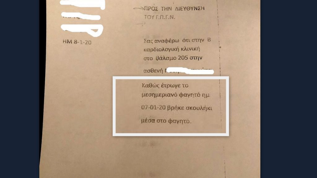 Σύμφωνα με την καταγγελία της ασθενούς και την αναφορά στη συνέχεια της Προϊσταμένης Νοσηλευτικής Υπηρεσίας του νοσοκομείου, «στη Β’ καρδιολογική κλινική, στον θάλαμο 205 και στην ασθενή (αναφέρεται το όνομα της νοσηλευομένης), καθώς έτρωγε το μεσημεριανό φαγητό βρήκε μέσα σε αυτό σκουλήκι».