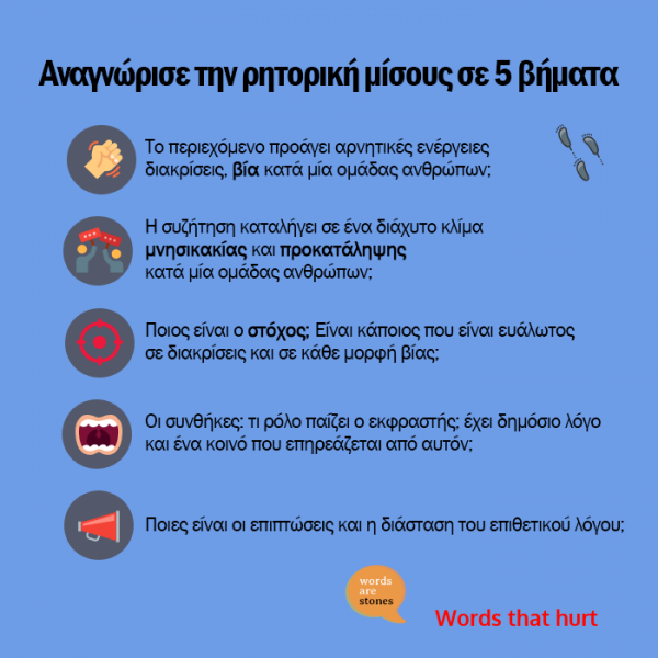 Σε ορισμένες χώρες η ρητορική μίσους διώκεται από τον νόμο, αλλά σε κάθε περίπτωση είναι δύσκολο να αποδειχτεί και να καταδικαστεί, υπογραμμίζεται στην καμπάνια «Words Are Stones» στην οποία συμμετέχουν οι οργανώσεις Lunaria Associazione (Ιταλία), «ΑΝΤΙΓΟΝΗ-Κέντρο Πληροφόρησης και Τεκμηρίωσης για το Ρατσισμό, την Οικολογία, την Ειρήνη και τη Μη Βία» (Ελλάδα), SOS Racisme (Ισπανία), Association pour le development des initiatives citoyennes (Γαλλία), Grenzenlos (Αυστρία), KISA (Κύπρος).