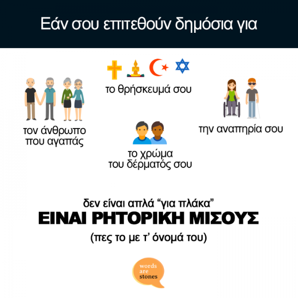 «Η ρητορική μίσους, είναι η λεκτική επίθεση που προσβάλλει ένα άτομο, ή μια ομάδα με βάση χαρακτηριστικά όπως το φύλο, την εθνοτική καταγωγή, τη θρησκεία, τη φυλή, την αναπηρία τον σεξουαλικό προσανατολισμό» είναι ο ορισμός που δίνεται στο πλαίσιο της καμπάνιας κατά του φαινομένου που συναντάται σε οποιαδήποτε μορφή έκφρασης.