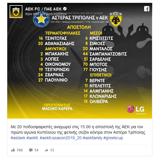 Με πολλές απουσίες πάει η ΑΕΚ στην Τρίπολη για τον αυριανό πρώτο αγώνα Κυπέλλου με τον Αστέρα Τρίπολης.