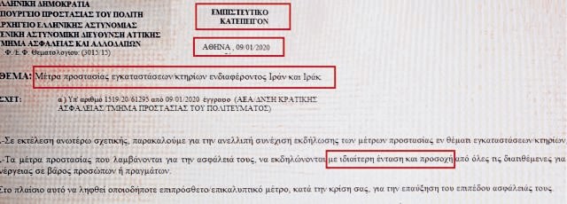 «ΤΑ ΝΕΑ» αποκαλύπτουν το εμπιστευτικό έγγραφο της ΕΛ.ΑΣ. στο οποίο αναδεικνύεται η ανησυχία των αρχών ασφαλείας στη χώρα μας για τα τεκταινόμενα στη Μέση Ανατολή μετά τη δολοφονία από τις ΗΠΑ του Κασέμ Σουλεϊμανί κοντά στο αεροδρόμιο της Βαγδάτης αλλά και το τραγικό συμβάν με την πτώση – στις 8 Ιανουαρίου – του Boeing 737 της Ukraine International Airlines ύστερα από πλήγμα ιρανικού πυραύλου.