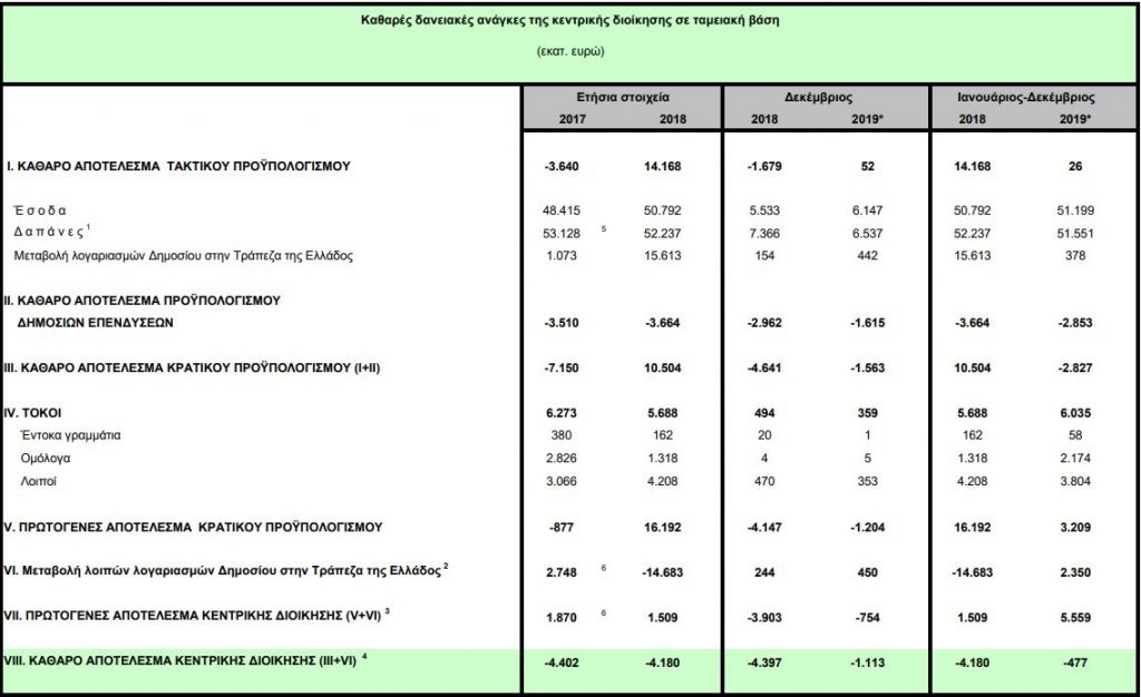 Την περίοδο Ιανουαρίου-Δεκεμβρίου 2019 το ταμειακό αποτέλεσμα της κεντρικής διοίκησης παρουσίασε έλλειμμα 477 εκατ. ευρώ, έναντι ελλείμματος 4,180 δισ. ευρώ την αντίστοιχη περίοδο του 2018.
