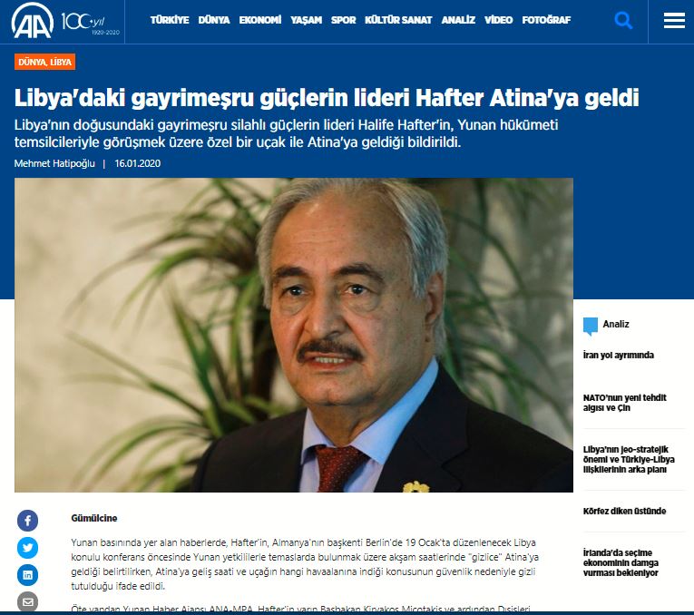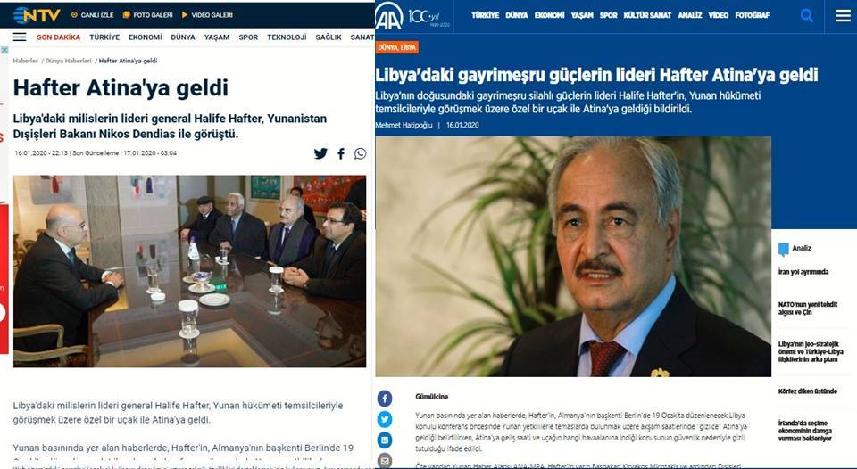 Το πρακτορείο ειδήσεων Anadolu μετέδωσε ότι «ο παράνομος ηγέτης της Λιβύης ήρθε στην Αθήνα. Ο Χαφτάρ θα συναντηθεί με Μητσοτάκη και Δένδια».
