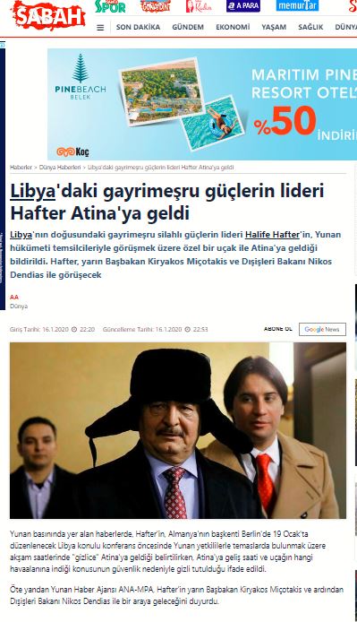 εφημερίδα Sabah στο ρεπορτάζ της αναφέρει: «O ηγέτης των παράνομων δυνάμεων στη Λιβύη ήρθε στην Αθήνα. Ταξίδεψε στην Αθήνα με ιδιωτικό αεροσκάφος και στόχος του να συναντηθεί με Ελληνες αξιωματούχους όπως τον υπουργό Εξωτερικών Δένδιας και τον πρωθυπουργό Μητσοτάκης».