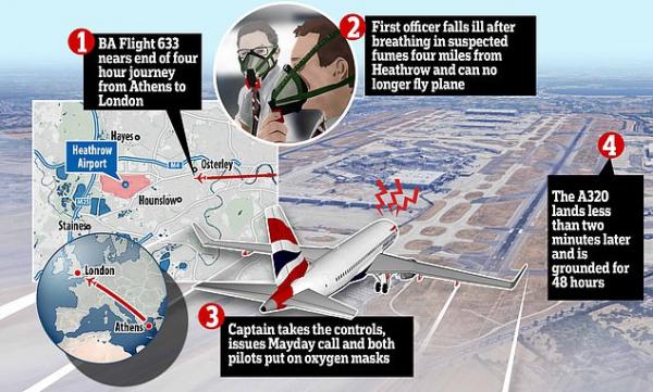 Σύμφωνα με την Daily Mail, ενώ η πτήση από Αθήνα προς Λονδίνο πλησίαζε προς το αεροδρόμιο Χίθροου, καπνοί άρχισαν να γεμίζουν το πιλοτήριο.