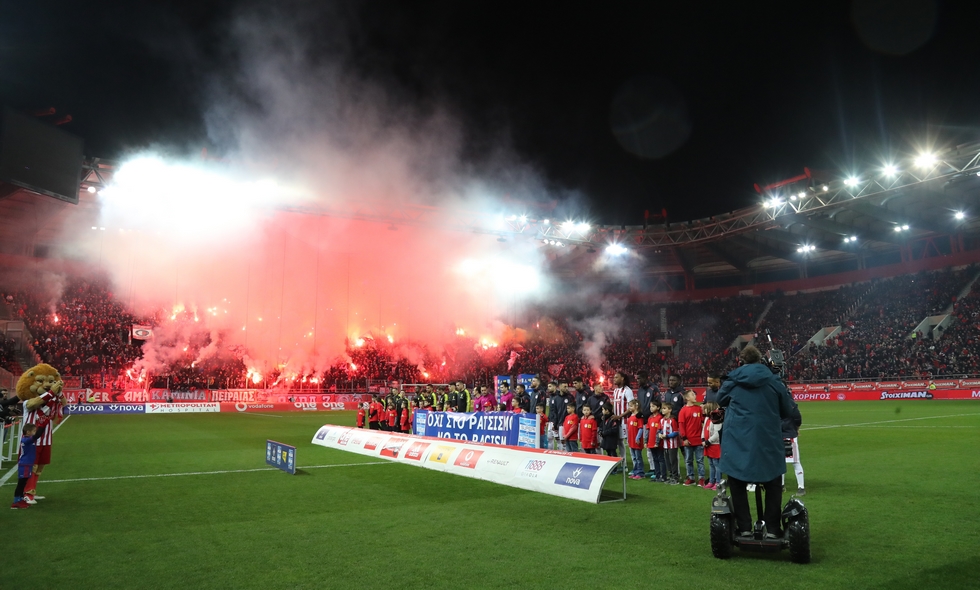Οι οπαδοί του Ολυμπιακού διασκέδασαν δεόντως με τα πεπραγμένα της «εξυγίανσης» και ασχολήθηκαν στα συνθήματα τους με την πολυϊδιοκτησία του Ιβάν Σαββίδη.
