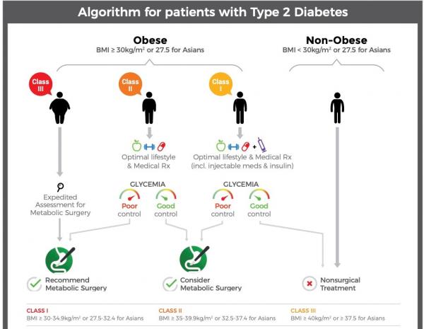 Η μεταβολική χειρουργική πρέπει επίσης να θεωρηθεί ως μια επιλογή για τη θεραπεία του T2D σε ασθενείς με παχυσαρκία κατηγορίας Ι (BMI 30,0-34,9 kg / m2) και ανεπαρκώς ελεγχόμενη υπεργλυκαιμία, παρά τη βέλτιστη ιατρική θεραπεία είτε από το στόμα είτε από ενέσιμα φάρμακα (συμπεριλαμβανομένης της ινσουλίνης).
