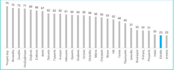 Οι επιδόσεις της πλειονότητας των Ευρωπαϊκών χωρών κυμαίνονται μεταξύ 46 και 62.
