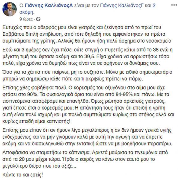 «Ευτυχώς που ο αδερφός μου είναι γιατρός και ξεκίνησα από το πρωί του Σαββάτου διπλή αντιβίωση, από τότε δηλαδή που εμφανίστηκαν τα πρώτα συμπτώματα της γρίπης. Αλλιώς θα ήμουν ήδη πολύ άσχημα στο νοσοκομείο
