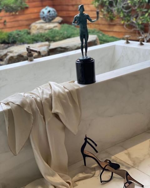 Στην άλλη φωτογραφία, το άσπρο σατέν φόρεμα της είναι στο πάτωμα και τα πέδιλα της είναι παρατημένα δίπλα σε μία μπανιέρα μετά τα βραβεία SAG.