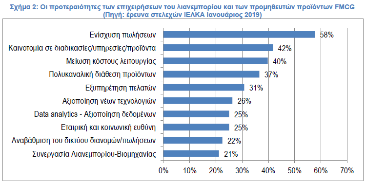 Ο βασικός προβληματισμός των επιχειρήσεων λιανεμπορίου και βιομηχανίας τροφίμων και FMCG είναι κυρίως η μείωση των πωλήσεων των τελευταίων ετών από το 58% των ερωτηθέντων. Η δεύτερη προτεραιότητα είναι η καινοτομία σε διαδικασίες, υπηρεσίες και προϊόντα με 42% η οποία αποσκοπεί σε ένα βαθμό στην πιο αποδοτική λειτουργία και η τρίτη προτεραιότητα με 40% είναι μείωση κόστους λειτουργίας.