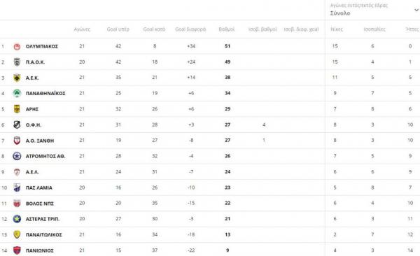 Οι δύο ομάδες δεν βρήκαν τον τρόπο να στείλουν την μπάλα στα δίχτυα και το ματς έληξε 0-0. Οι «ερυθρόλευκοι» παραμένουν στην κορυφή της Super League με 51 βαθμούς, ενώ ακολουθεί ο ΠΑΟΚ με 49. Σταθερά 3η η ΑΕΚ με 38 βαθμούς.