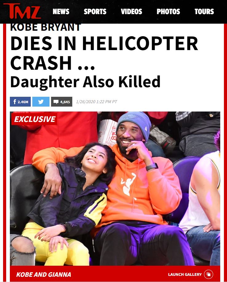 Πρώτες μετέδωσαν την τραγική είδηση του θανάτου της κόρης του Μπράιαντ, η Mirror και η Dailymail, ενώ και το TMZ μεταδίδει ότι μεταξύ των επιβαινόντων βρισκόταν η μία από τις τέσσερις κόρες του, η οποία επίσης είναι νεκρή.