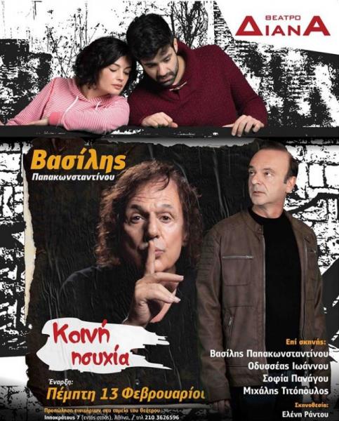 Ο Οδυσσέας Ιωάννου από τις 13 Φεβρουαρίου θα βρίσκεται ξανά στη σκηνή του Θεάτρου Διάνα μαζί με τον Βασίλη Παπακωνσταντίου και τους ηθοποιούς Σοφία Πανάγου και Μιχάλη Τιτόπουλο για να παρουσιάσουν την νέα παράσταση «Κοινή ησυχία» σε σκηνοθεσία Ελένης Ράντου