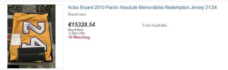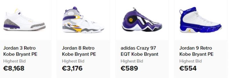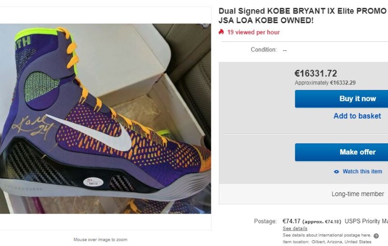 Μεταξύ άλλων, στο Ebay έχουν ανέβει αγγελίες και για παπούτσια, με ένα ζευγάρι που -κατά τον πωλητή- φέρει την υπογραφή του Κόμπι Μπράιαντ να πωλείται έναντι 16.330 ευρώ: