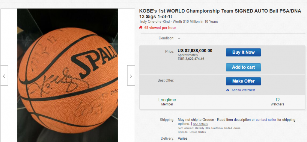 Ο πωλητής μάλιστα ισχυρίζεται στην περιγραφή: «Η τιμή για το αυτόγραφο του Κόμπι θα συνεχίσει να αυξάνεται καθώς πέθανε σε ηλικία 41 ετών και δεν θα υπογράψει ποτέ ξανά. Η μπάλα αυτή θα αξίζει 10 εκατομμύρια δολάρια σε 10 χρόνια».
