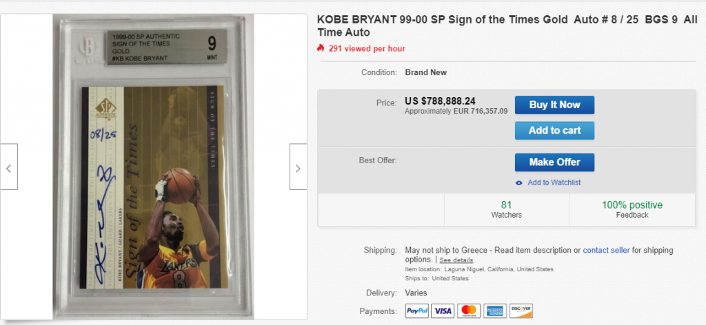 Άλλο ένα πανάκριβο προϊόν προς πώληση είναι μια κάρτα με τον Κόμπι Μπράιαντ, η οποία ξεπερνάει σε τιμή τις 700.000 χιλιάδες ευρώ.