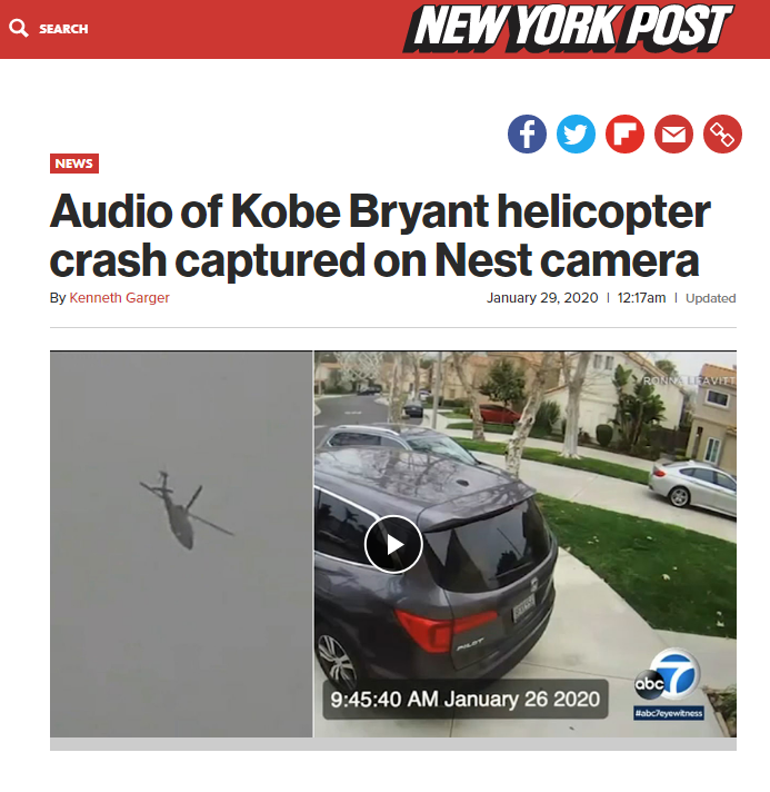 Το ηχητικό προέρχεται από κάμερα ασφαλείας σπιτιού στο Καλαμπάσας, στην Καλιφόρνια, δηλαδή την περιοχή που συνετρίβη το μοιραίο ελικόπτερο.